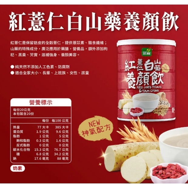 紅薏仁白山藥養顏飲 使用保留麩皮的全穀紅薏仁,提供豐富薏苡素及膳食纖維。 添加山藥的特殊成分,加上枸杞、黑棗、芡實,是滋補強身、養顏美容的營養食品。 純天然不添加人工色素、防腐劑 適合全家大小、長輩、上班族、女性、孩童 每罐 : 400公克 每箱 : 12罐 保存期限:18個月 每箱毛重 : 6.3kgs 外箱尺寸 : 418*318*156mm 原產地:台灣